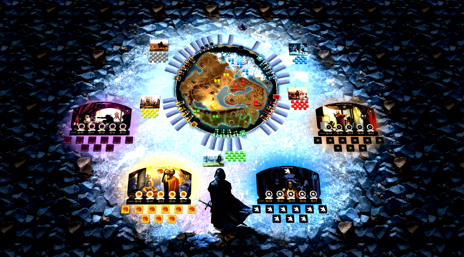 A War of Whispers is a competitive board game for 2 to 4 players. Five mighty empires are at war for the world, but you are no mighty ruler. Instead, you play a secret society that is betting on the results of this war while pulling strings to rig the results and ensure their bets pay off. A War of Whispers is a game of deep strategy, hidden agendas, and shifting loyalties.