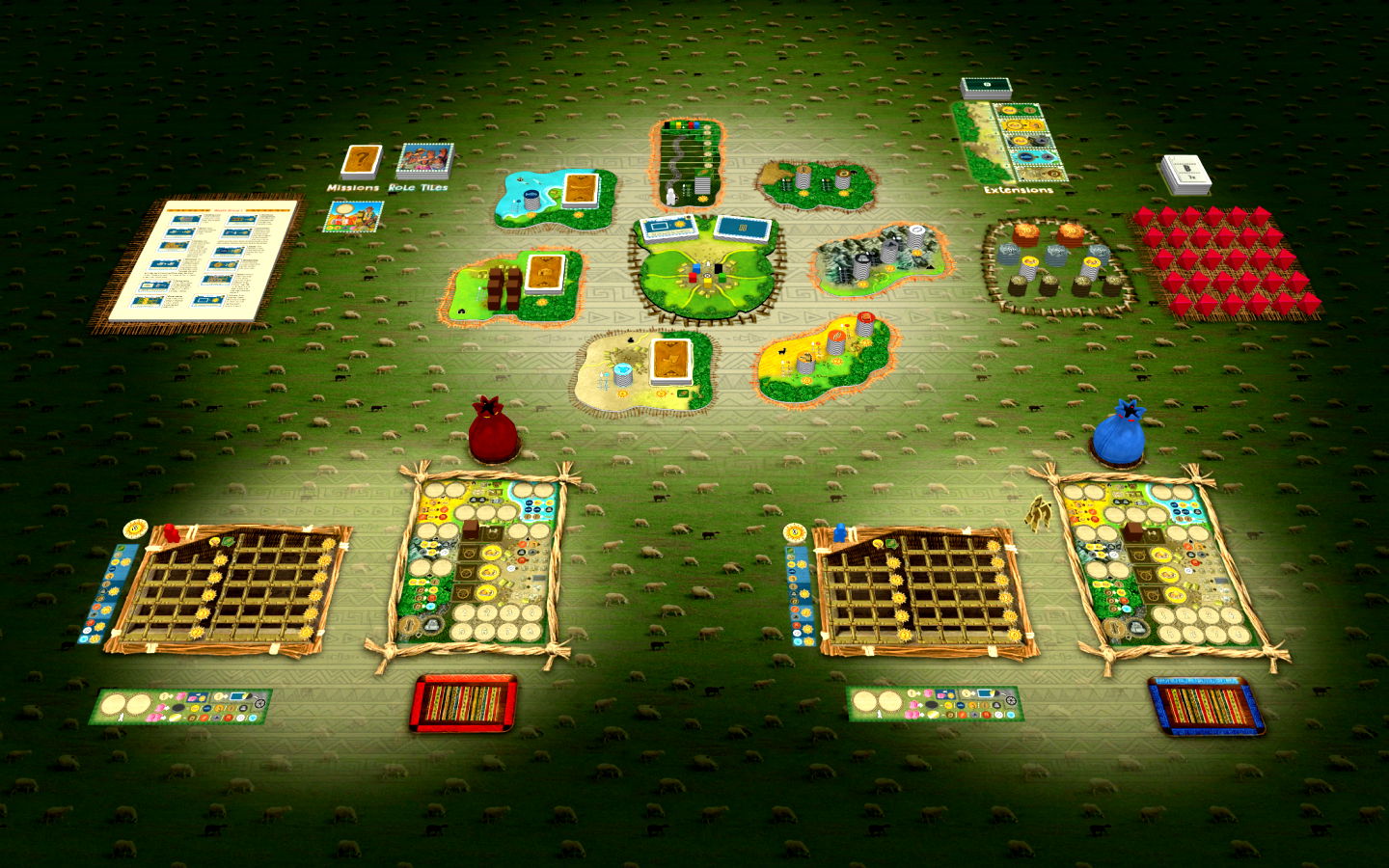 At the start of the game, players have access only to certain resources and goods, due to the different role tiles that each player receives that provide them. At the market, however, a player can acquire additional production sites that give new options. The numerous goods — such as fish, alpaca, cacao, silver, or corn — all have their own characteristics and places where they can be used. Whereas silver makes you rich, fish can be exchanged for other goods, and alpaca give you wool that you can then make into cloth.
