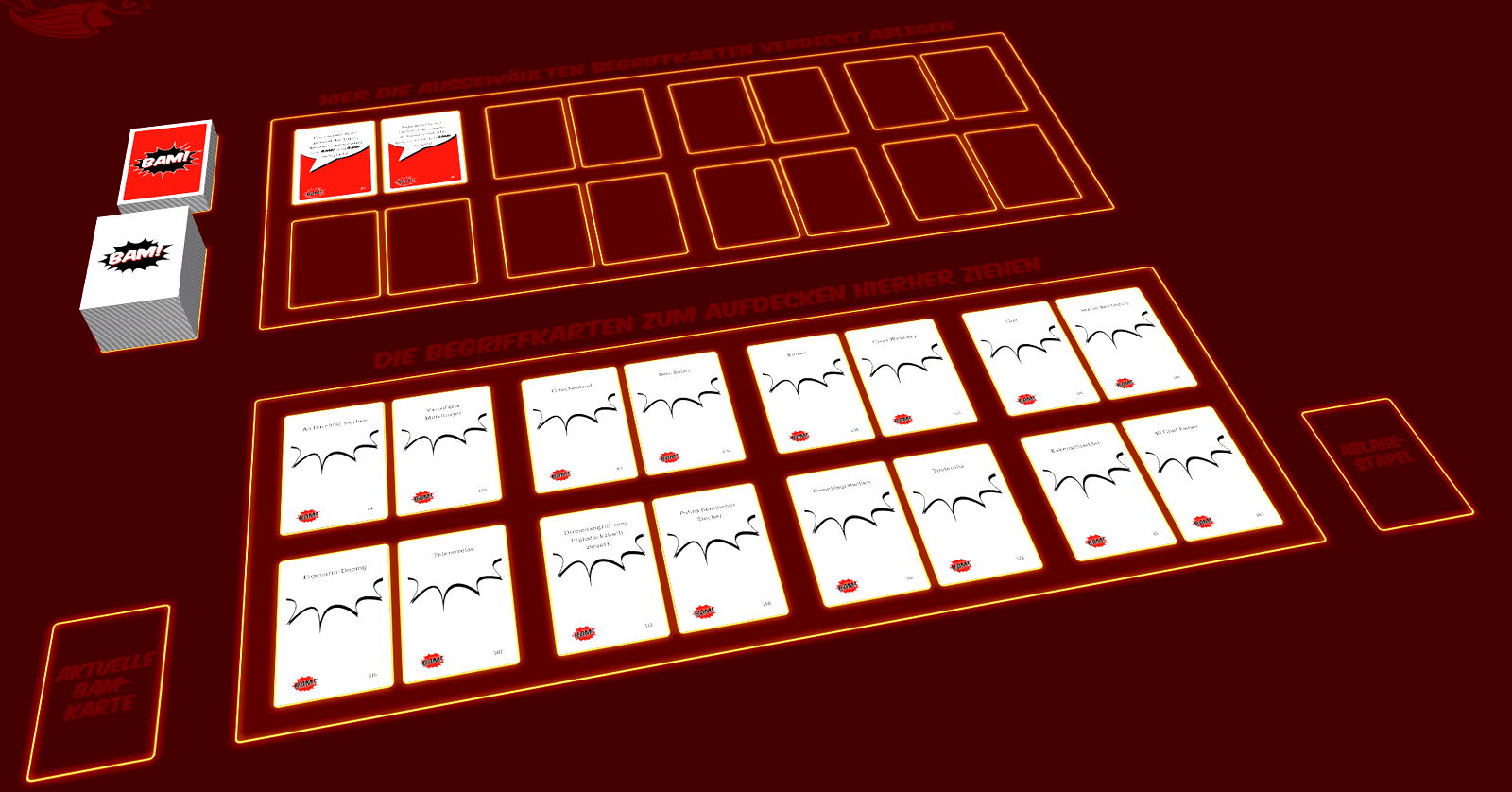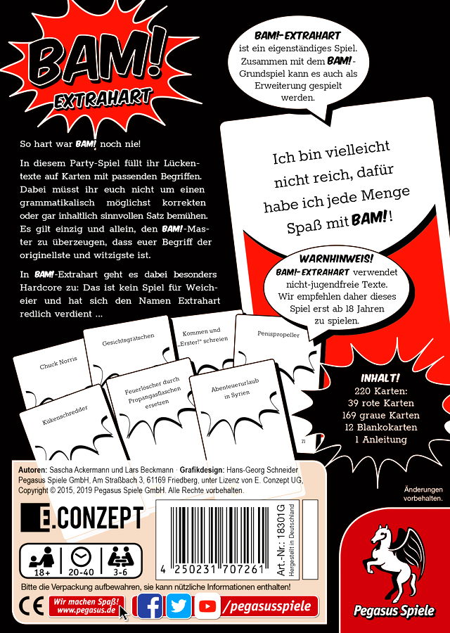 Wer sich schon immer gedacht hat: Alles was ich will ist BAM!, der kommt jetzt voll auf seine Kosten: Mit BAM! Ultraschmutzig gibt es das Beste aus dem Grundspiel und den beiden eigenständigen Erweiterungen in einer bombastischen Kompilationsbox mit über 700 Karten – und das auch noch zu einem unschlagbar guten Preis. Frei nach dem Motto: Wenn schon schmutzig, dann richtig schmutzig! Und zur Feier dieses unanständig guten Rundum-Sorglos-Pakets gibt es auch noch ein BAMtastisches neues Coverartwork oben drauf. Natürlich liegen dem Spiel wie immer auch ein paar Blankokarten bei, die die Spieler mit ihren besten eigenen Ideen versehen können.