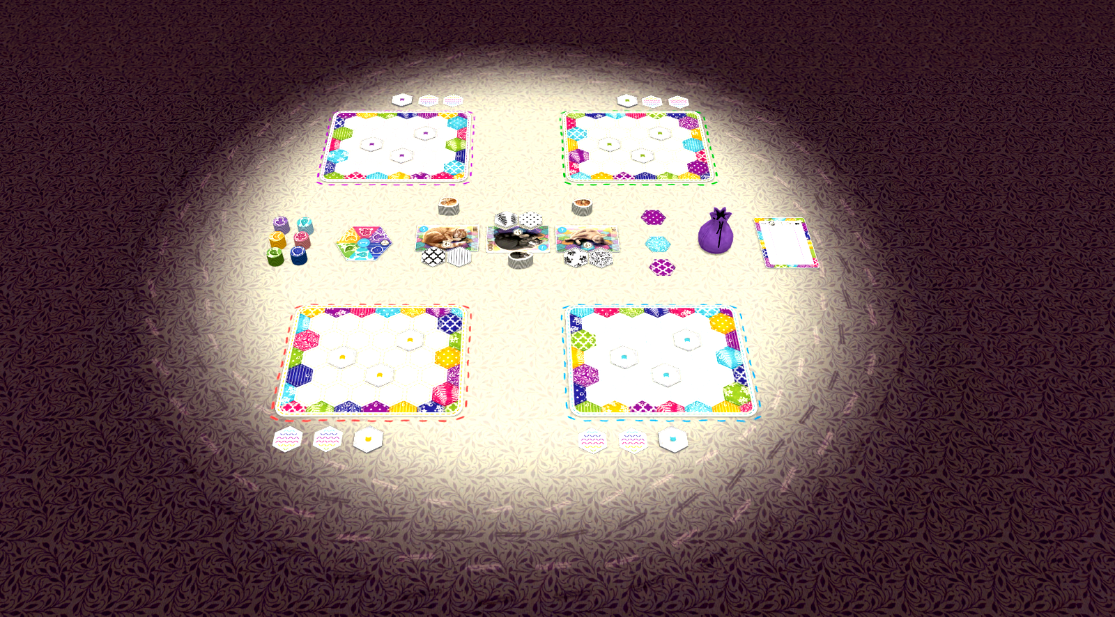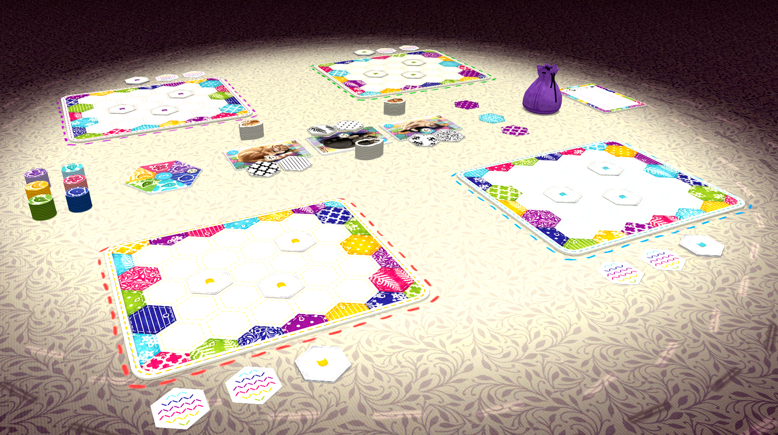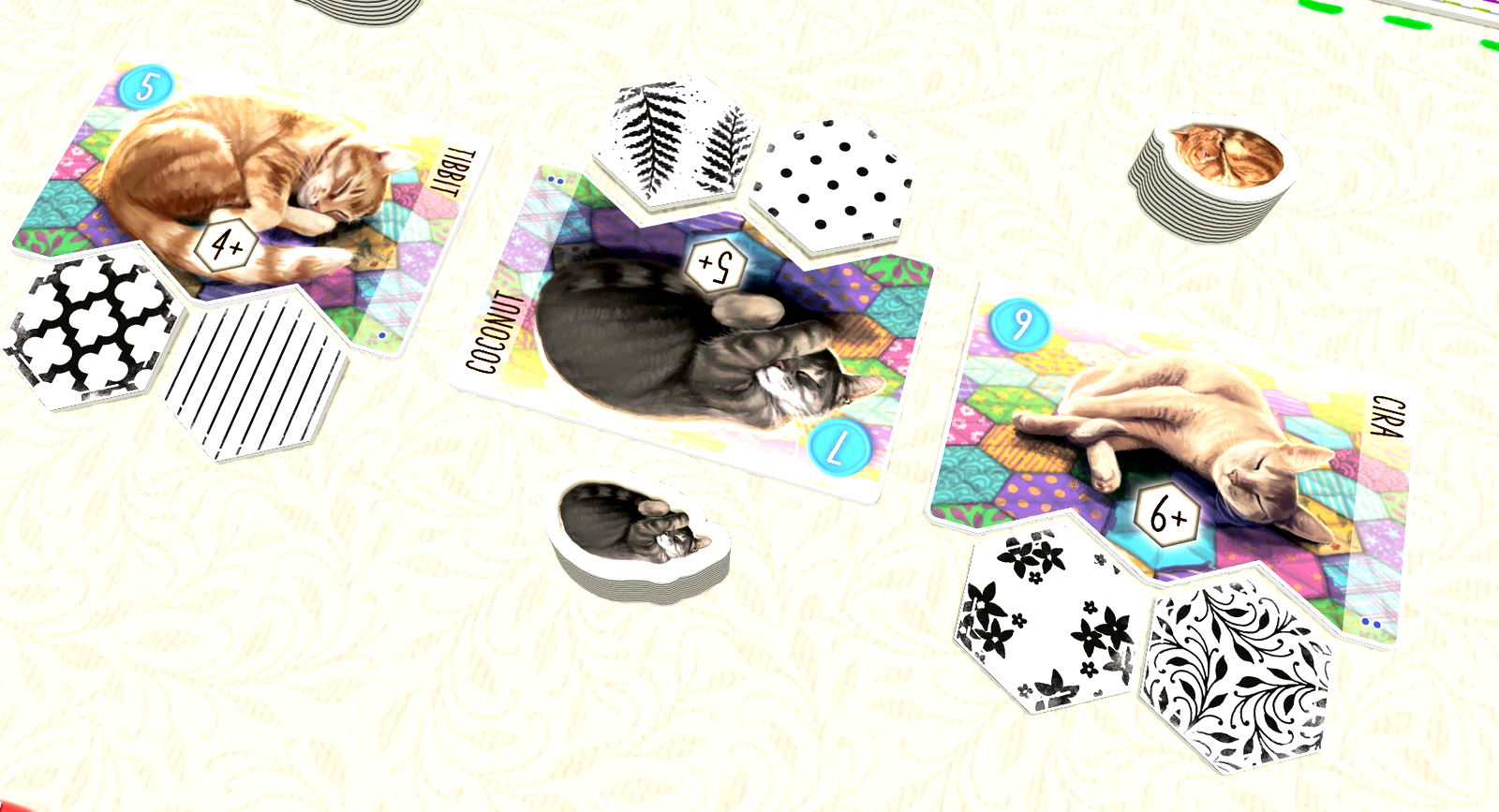 In Calico, players compete to sew the coziest quilt as they collect and place patches of different colors and patterns. Each quilt has a particular pattern that must be followed, and players are also trying to create color and pattern combinations that are not only aesthetically pleasing, but also able to attract the cuddliest cats!