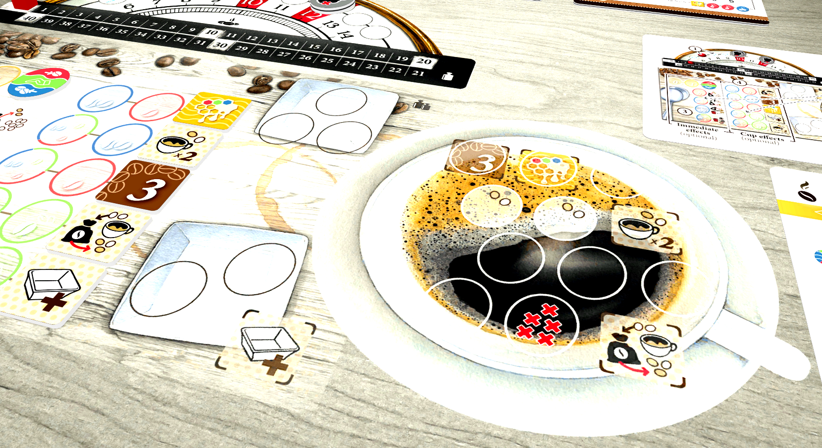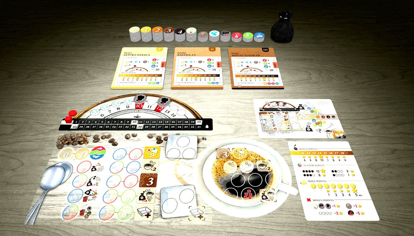 Coffee Roaster is a solitaire pool-building game. You choose a variety of coffee beans you want to roast, and put a number of tokens specific to that variety into a bag. Each turn, you draw a number of bean tokens randomly from the bag to advance their roast level. When you are finished, you mak...