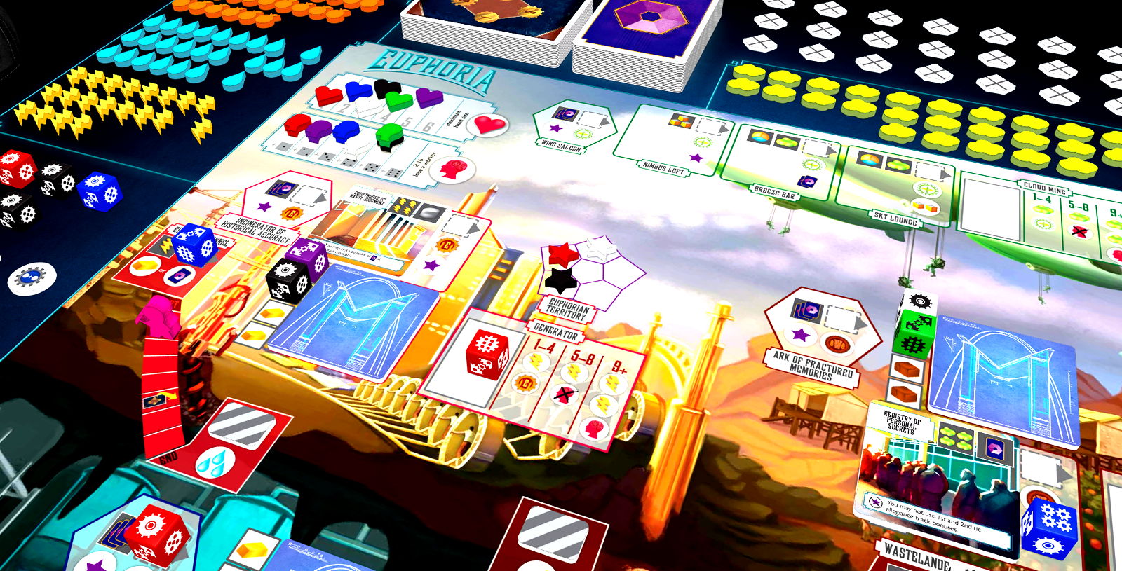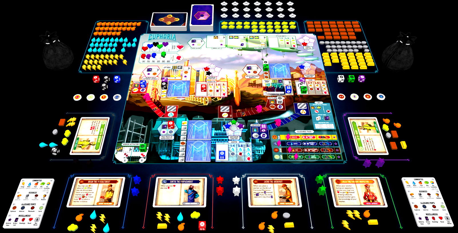Euphoria is a worker-placement game in which dice are your workers. The number on each die represents a worker's knowledge — that is, his level of awareness that he's in a dystopia. Worker knowledge enables various bonuses and impacts player interaction. If the collective knowledge of all of your available workers gets too high, one of them might desert you. You also have two elite recruit cards at your disposal; one has pledged allegiance to you, but the other needs some convincing. You can reveal and use the reticent recruit by reaching certain milestones in the game... or by letting other players unwittingly reach those milestones for you.