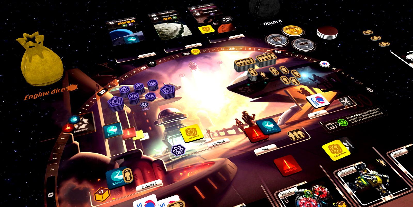 In the near future, talented space entrepreneurs and agencies set out to explore, mine, and colonize outer space. Your organization will compete to design the most efficient and powerful spacecraft, to gather scientific knowledge, construct facilities on distant worlds, and transport colonists to the farthest reaches of our Solar System. Charge up the monster rocket boosters, crew up, and race for space!