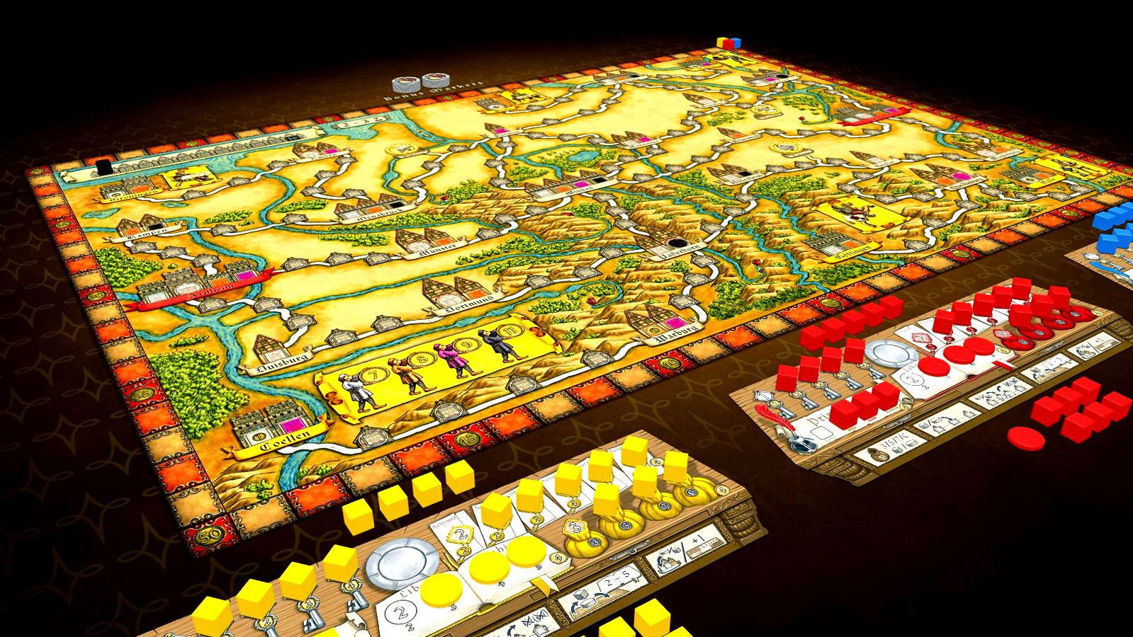 Players accomplish various activities during their moves. Traders may be inserted on the gameboard, moved, or even displace traders from other players. If they eventually occupy an entire trade route between two cities, a new Kontor may be established. But players may also develop their trading skills instead in particular cities, improving their abilities throughout the course of play. Winner of the game is the player who gains most prestige points.