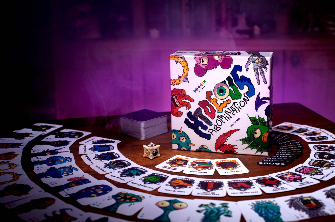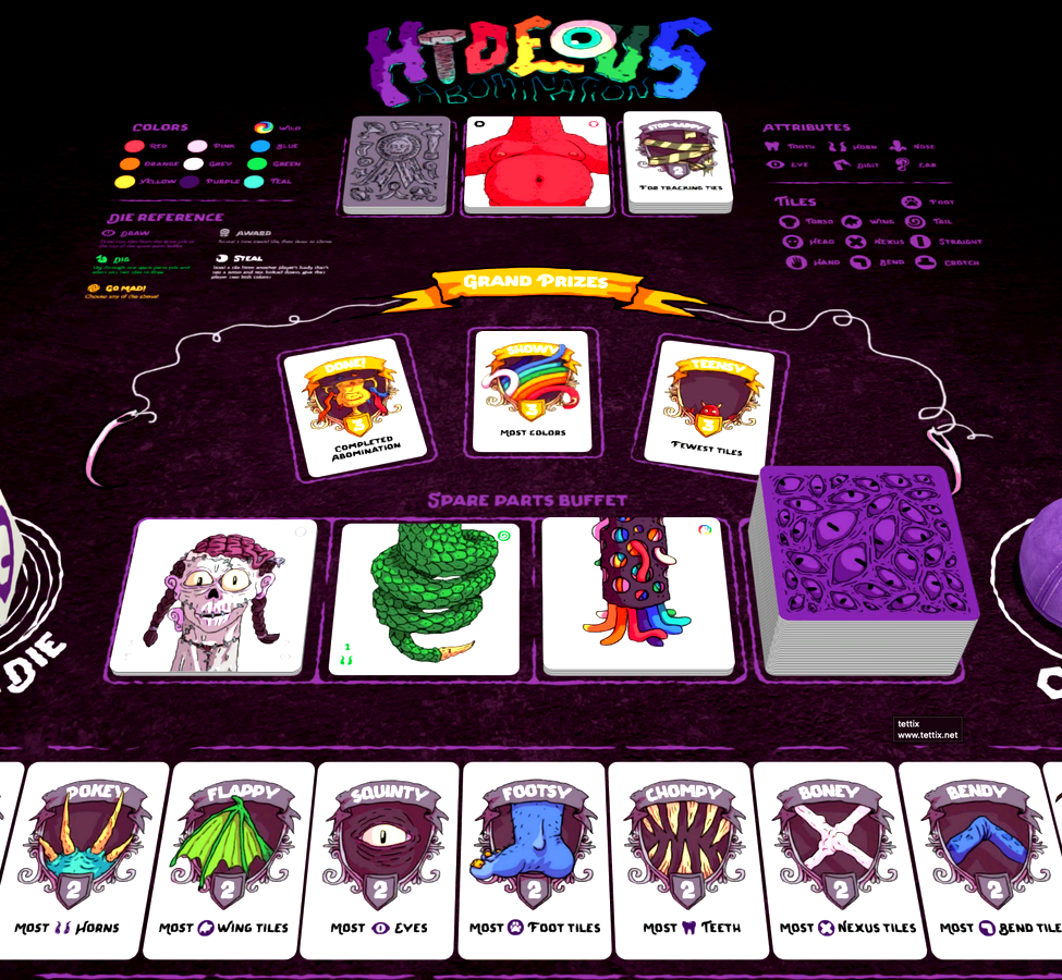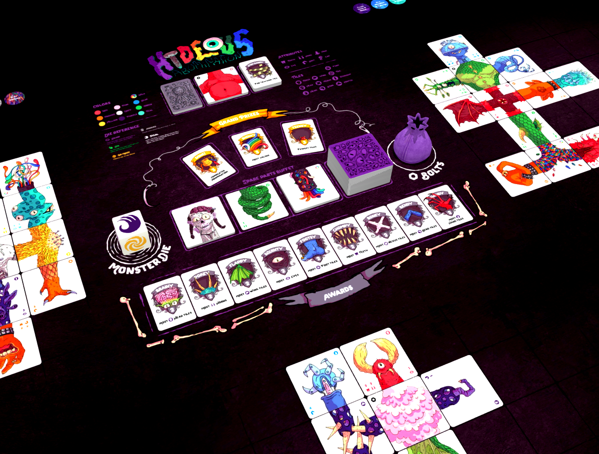 Sharpen your bone saws and practice your whipstitching, the competition has begun! Take turns laying body part tiles to build your own unique abomination, trying to get the most desirable features and win the most trophies.