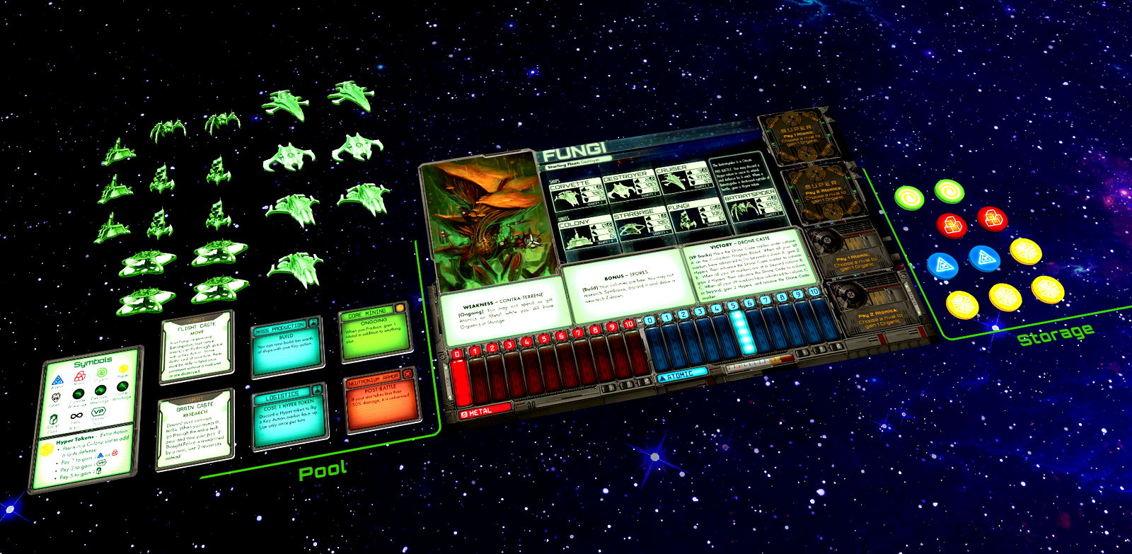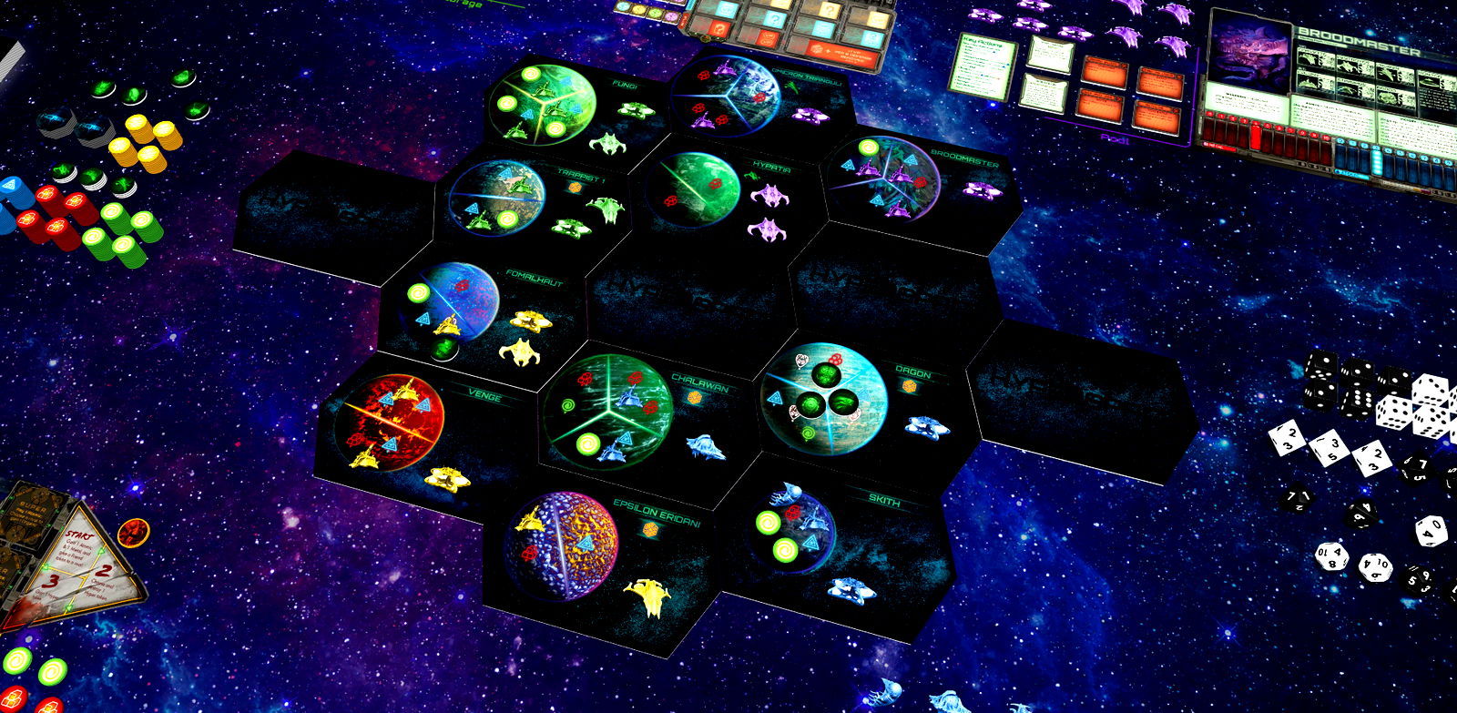 Hyperspace is a fast-moving 2-4 player asymmetric 4X strategy game about interstellar expansion. In it, you take the part of an interstellar civilization competing to control a newly-discovered star cluster! Construct your empire, fight for resources, and research technology. Each alien species has its own unique flaws and advantages, and victory lies in recognizing this. The game is physically attractive, and includes well over one hundred figures of spaceships, starbases, colonies, alien citizens, and so forth. It takes place in a star cluster built up of individual pieces that changes every time you play.