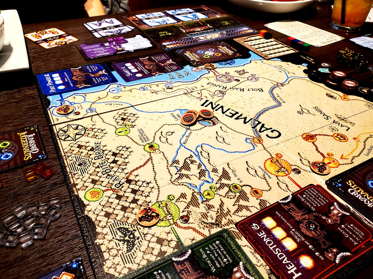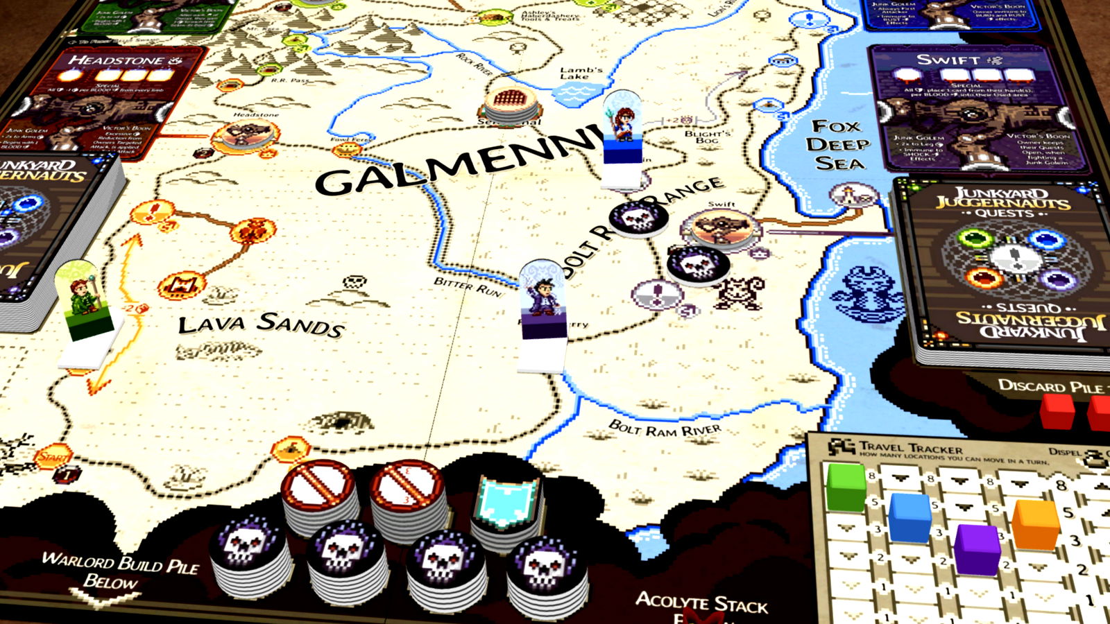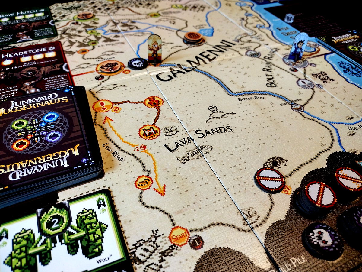 Now you must construct a mech (Juggernaut) from the cards you find there, and adventure across the land in search of the Warlord's lair. But take care, as one of you will be tempted into becoming the Warlord's Acolyte, fighting against your kin.