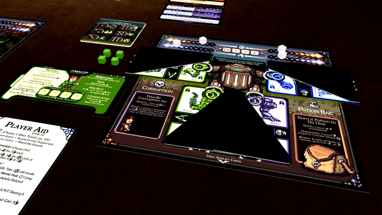 Extra Mettle cubes are stored in the grey pouch to the left of the game board.