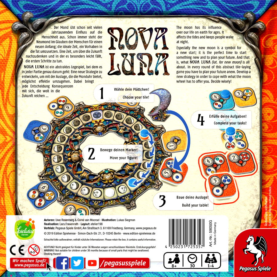 The new moon is a symbol for a new beginning, the perfect time to start something new and to plan your future — and that is what Nova Luna (lat. for new moon) is all about. In each round of this abstract tile-laying game, you have to plan your future anew, developing a new strategy to cope with what...