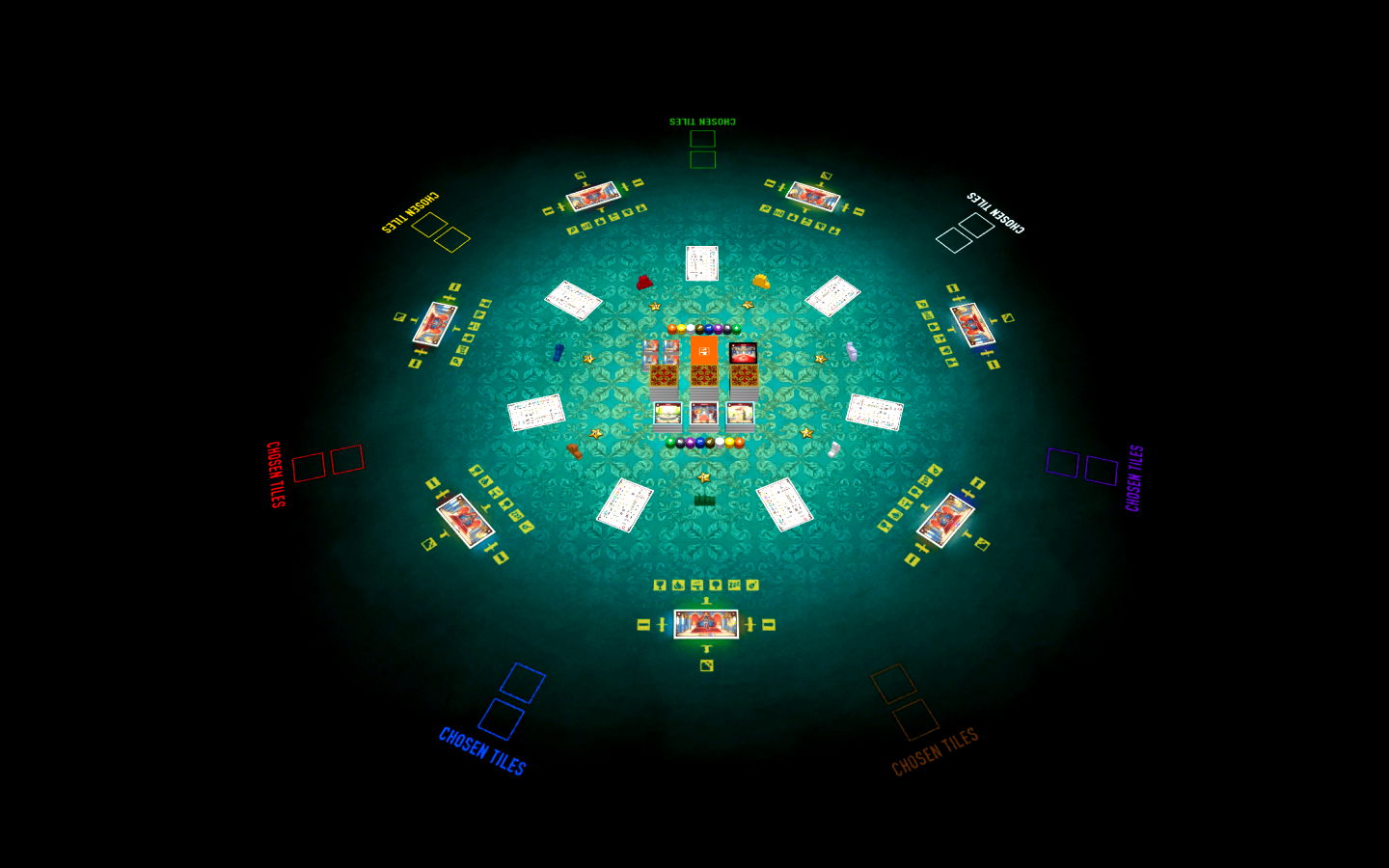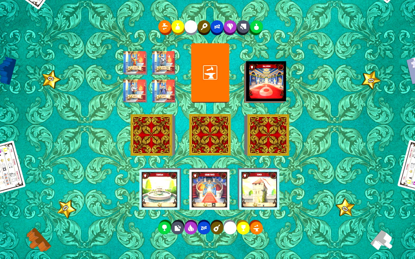 Between Two Castles of Mad King Ludwig is a competitive tile-drafting game in which each tile is a room in a castle. You work together with the player on your left to design one castle, and with the player on your right on another castle. On each turn you select two tiles from your hand, reveal them, then work with your partners to place them. To win, you have to share your attention and your devotion between two castles.
