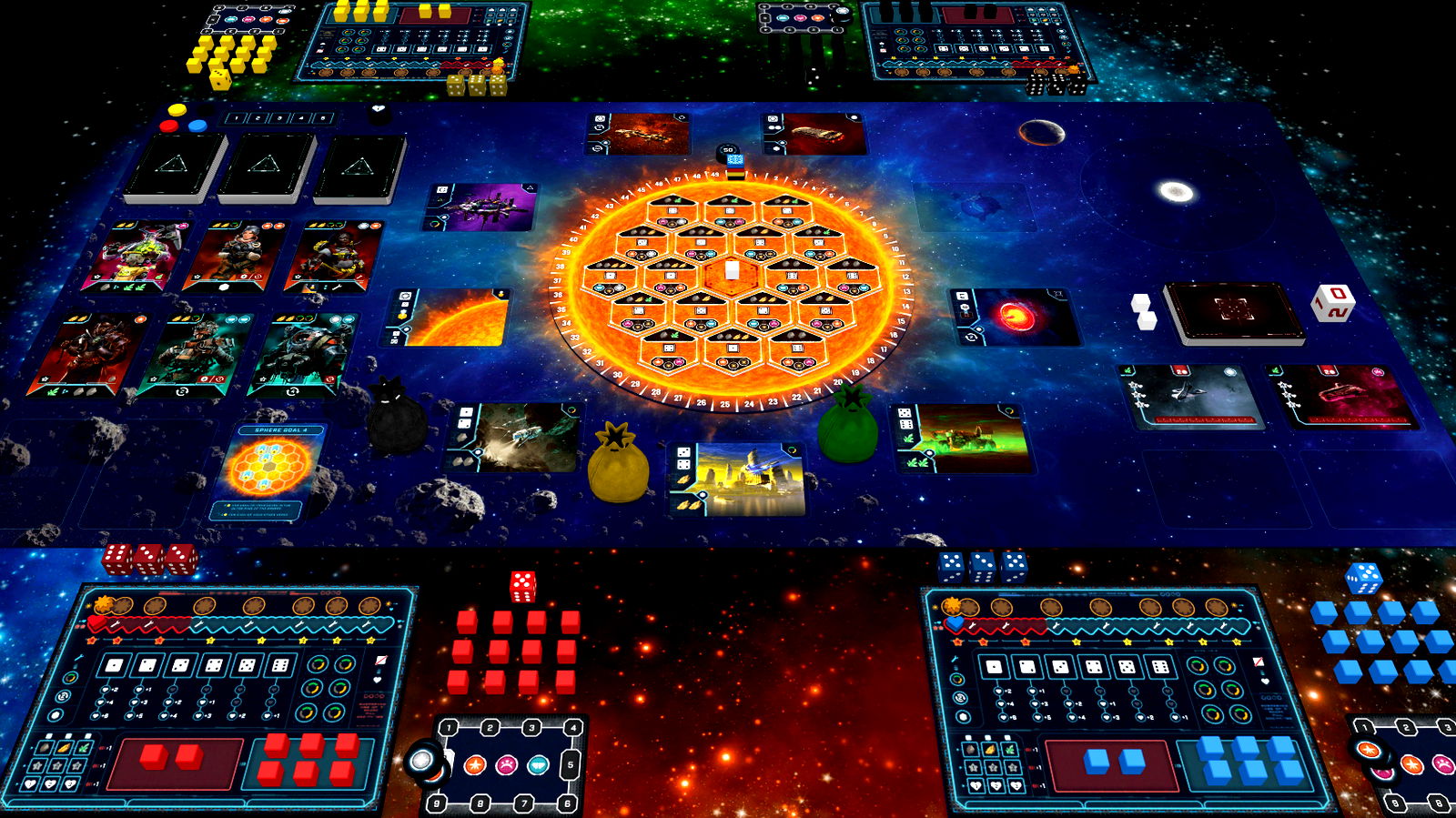 Solar Sphere is a dice placement/manipulation game with elements of engine building, resource management, and set collection. Set hundreds of years in the future in a time when competition will move mankind forward, but when collaboration is also sometimes necessary. In Solar Sphere, each player commands a mothership. Their primary task is to build a dyson sphere. But, with crew to hire and aliens attacking the sphere, there are many other ways to earn prestige and become the saviour of mankind.