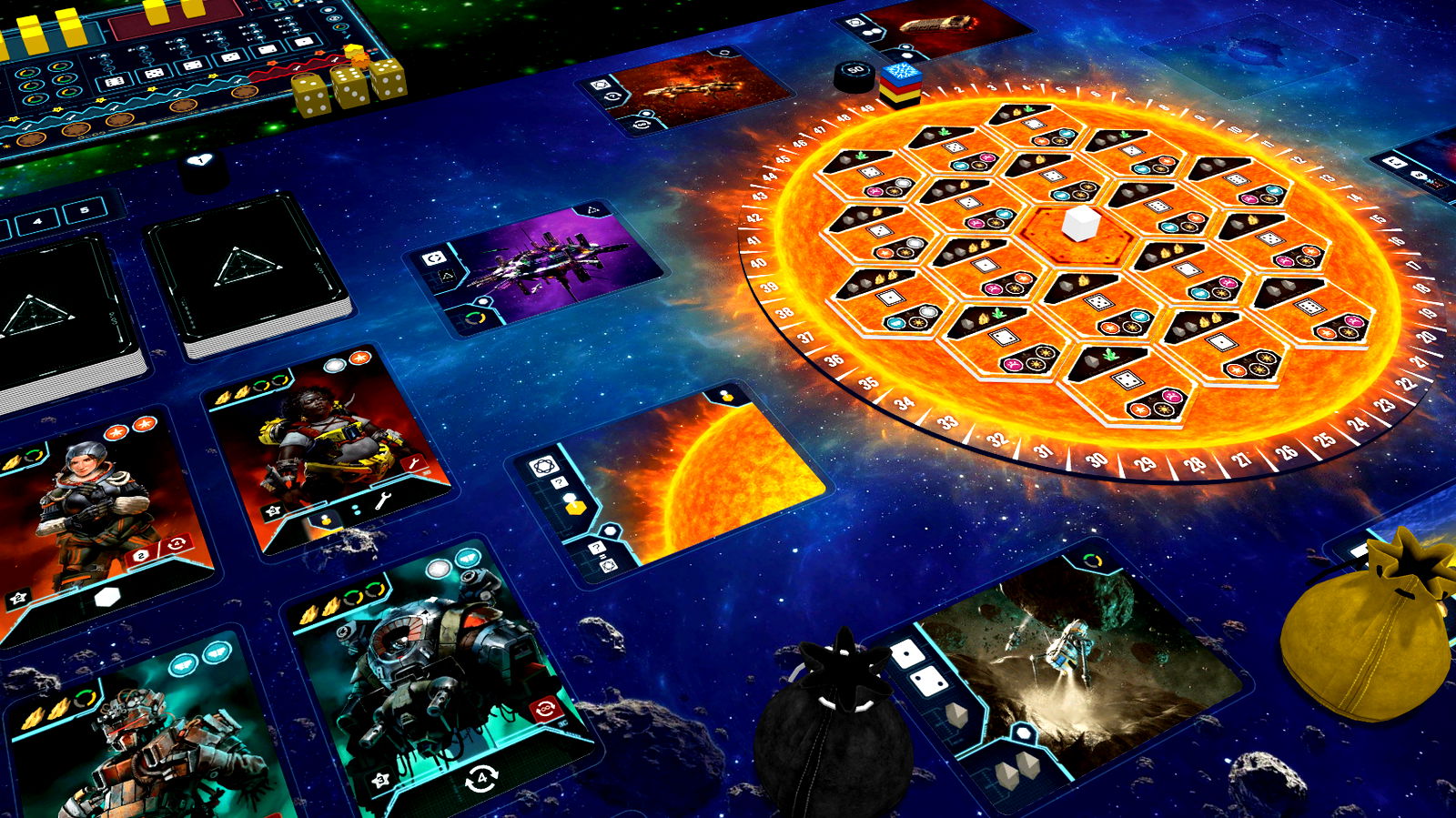 Players simultaneously start the turn by rolling their dice. Dice act as spacecraft and are sent, in payer order, to locations to gather resources, build the dyson sphere, build or recycle drones, upgrade worker spots, hire crew, and fight off aliens.