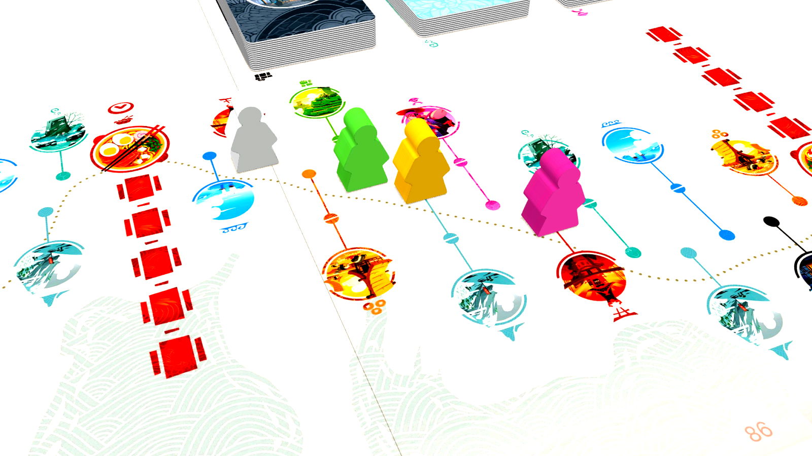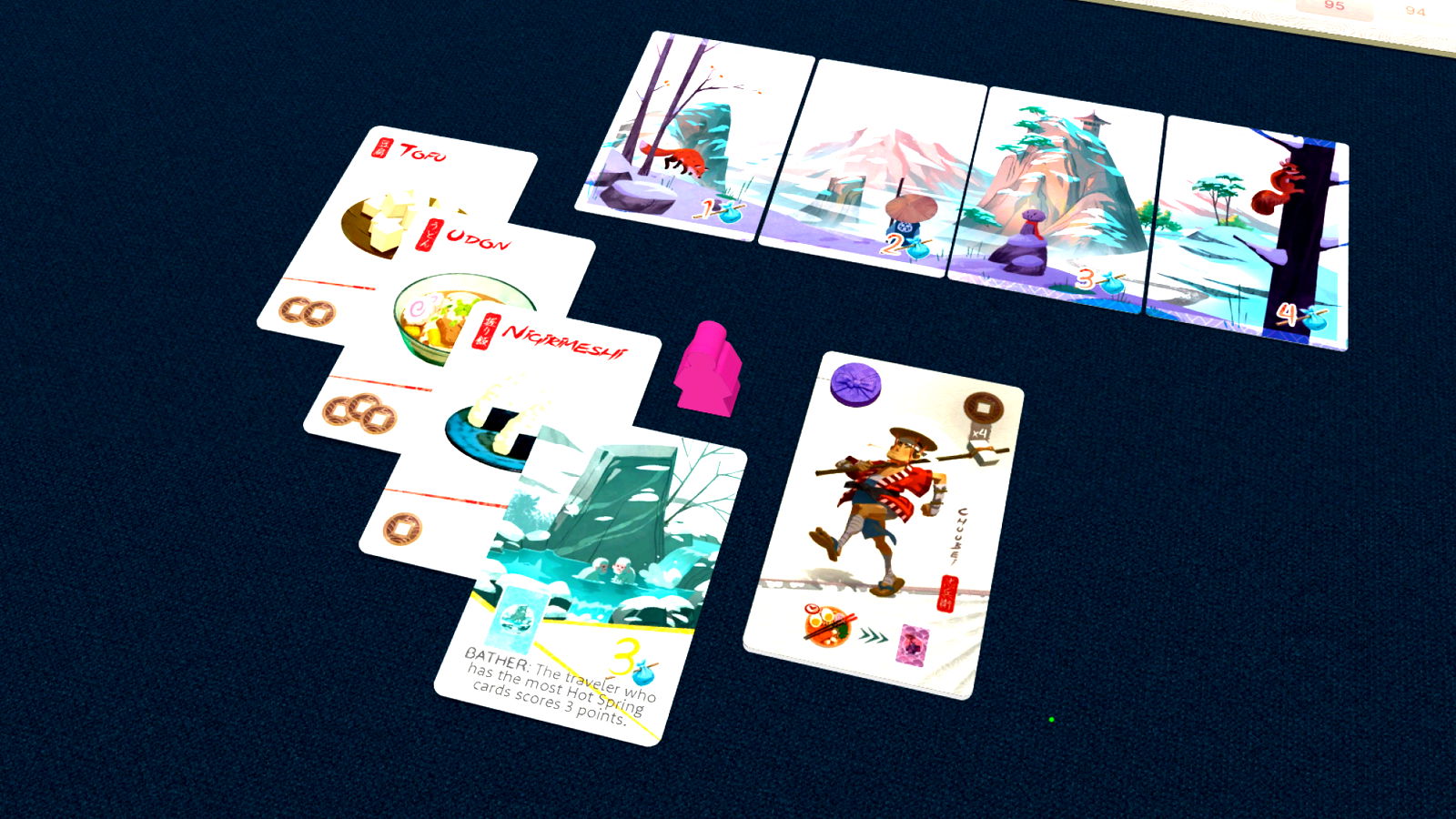 In Tokaido, you are a traveler in ancient Japan. You will follow the prestigious Tokaido–a road between Kyoto and Edo (Tokyo)–as you try to have a rich and fulfilling experience. Pass through magnificent countryside, taste delicious culinary specialties, purchase souvenirs, benefit from the virtues of hot springs, and have unforgettable encounters on your journey.