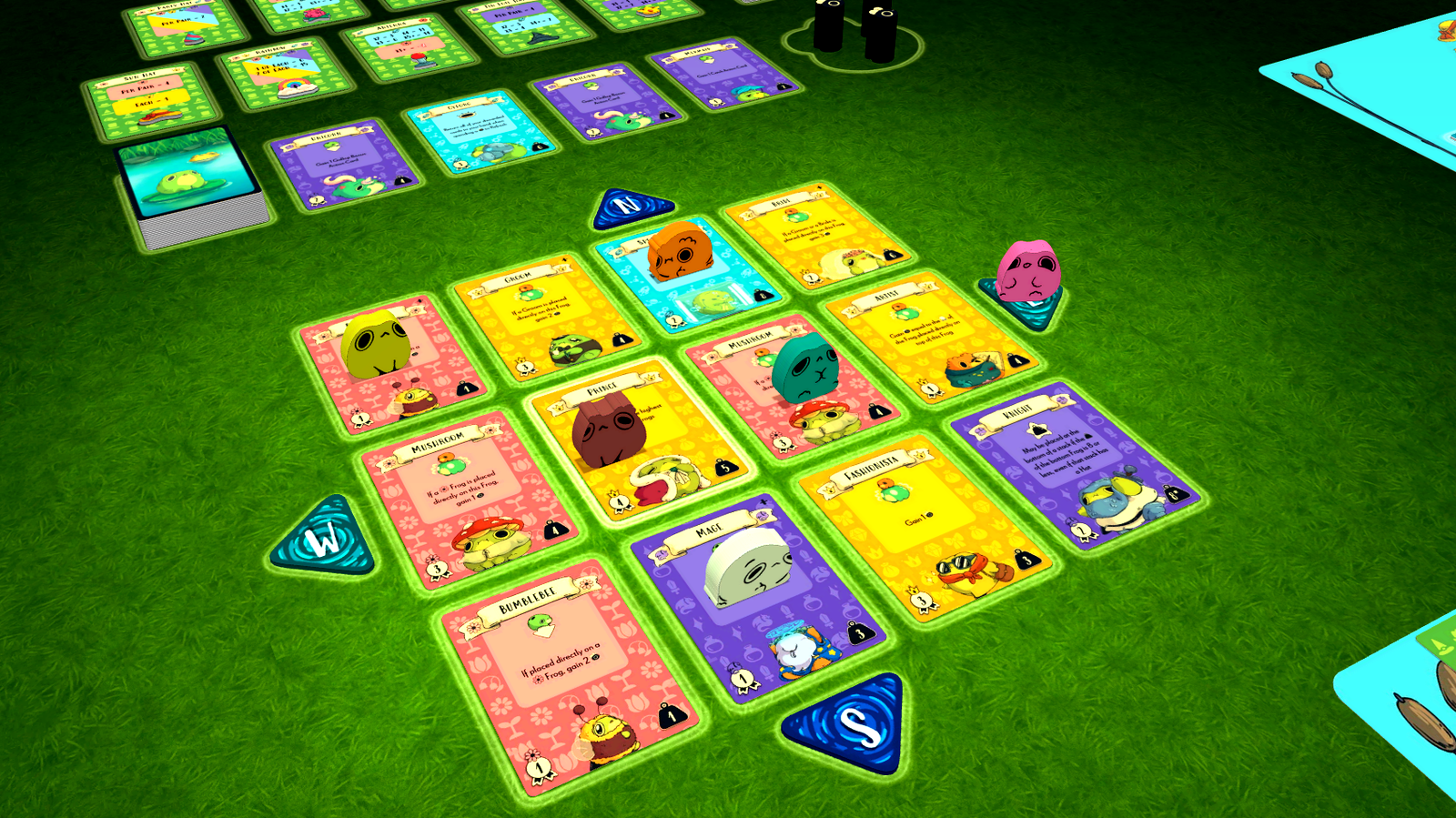 However, it won’t be so easy. The actions in Top Frog are simultaneous, with each player deciding where they leap to and what they will catch at the same time. Efficient use of your Action Cards is simple, until other players want the same cards as you! If 2 or more players try to catch the same Frog at the same time, neither player gets it. Deducing other players' intentions can save you valuable time.