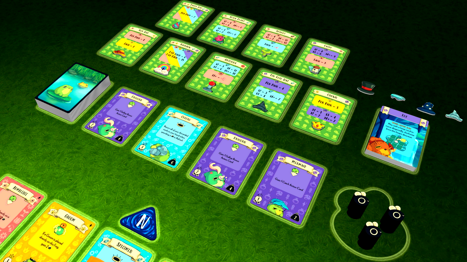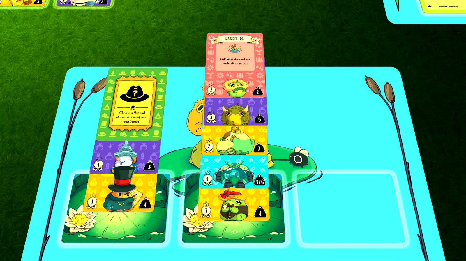 In Top Frog, you will be catching and stacking stylish frogs on top of each other to score the most points by the end of the game. Leap around the Pond and catch Frogs to add to your stacks. But pay attention to their weights! Only a Frog of equal or less weight can be placed on top of another Frog, and you can only have up to 3 stacks. Build up the ideal stack of Frogs and score big points by placing the appropriate hat on top!