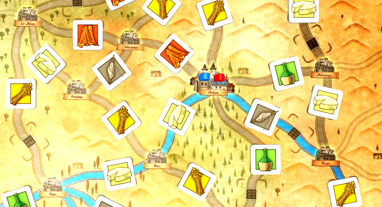 Orders: a new set of cards, each depicting goods and a city - collect the goods and turn them in at the city for victory points