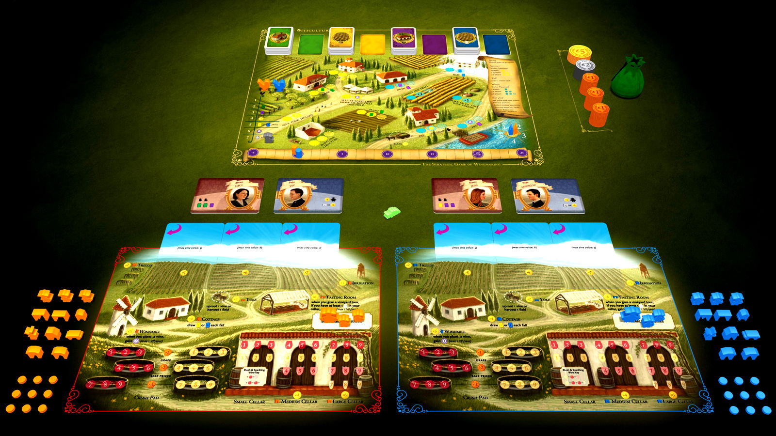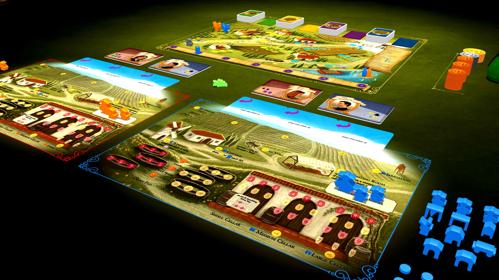 In Viticulture, the players find themselves in the roles of people in rustic, pre-modern Tuscany who have inherited meager vineyards. They have a few plots of land, an old crushpad, a tiny cellar, and three workers. They each have a dream of being the first to call their winery a true success.