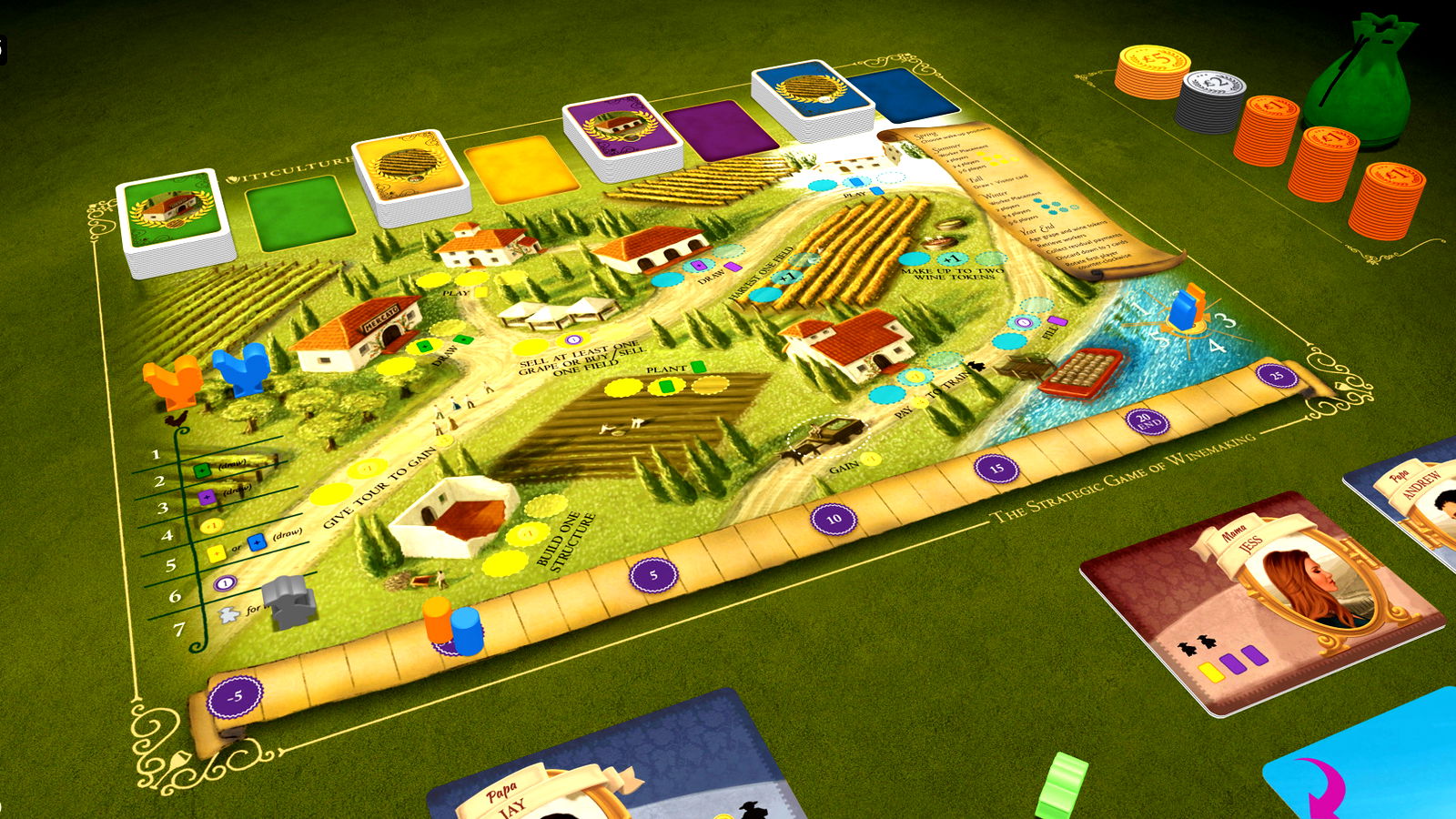 Using those workers and visitors, players can expand their vineyards by building structures, planting vines (vine cards), and filling wine orders (wine order cards). Players work towards the goal of running the most successful winery in Tuscany.