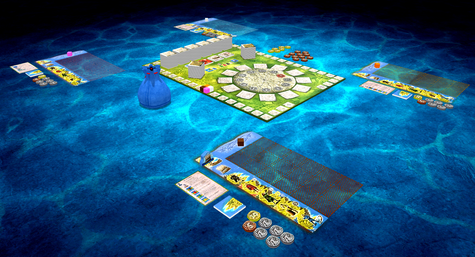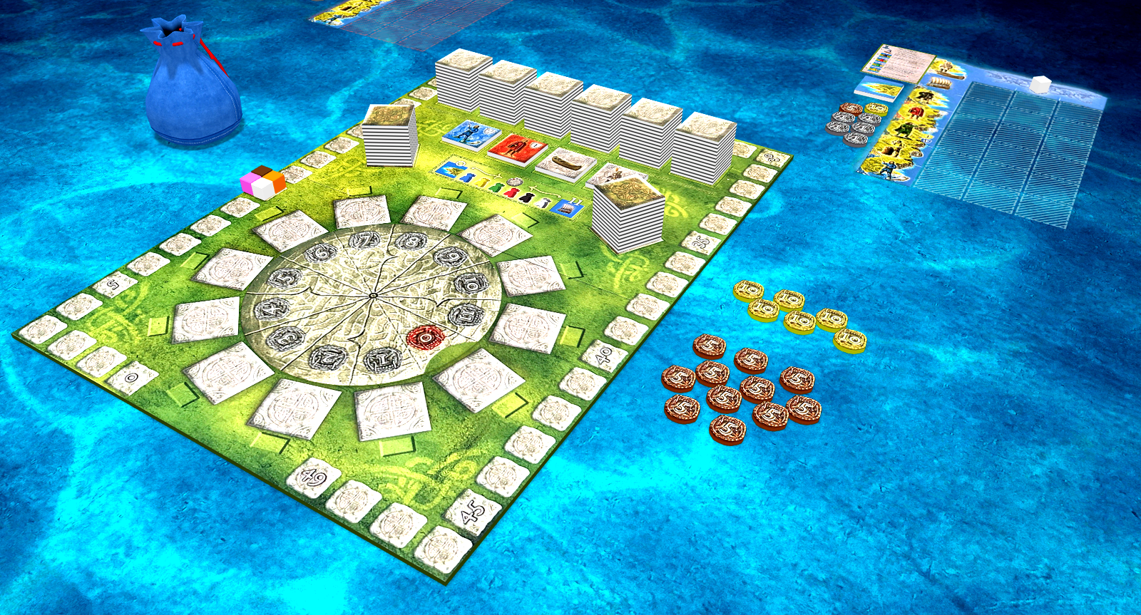 The resources in the game consist of coins and several types of ship tiles, island tiles and meeples. In each of 6 rounds, a random set of 12 tiles and 12 meeples becomes available...